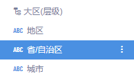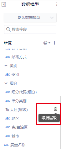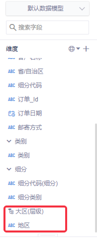 在默认数据模型中,有数据字段如下图所示,有国家、地区、省/自治区、市。需要将其设置为按照地区-省-市的层级关系。