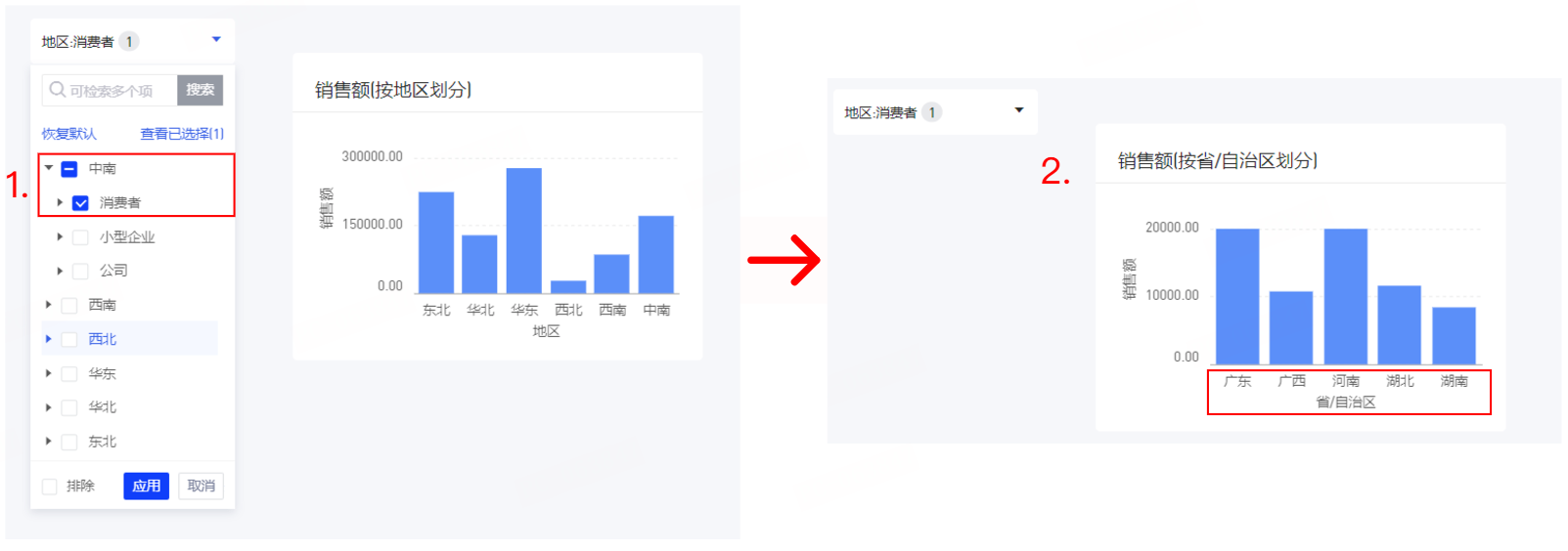 (4)进入预览界面,在树形筛选器中,选择[中南]-[消费者],点击应用,图表将自动下钻,如下图,自动智能下钻到省/自治区维度;