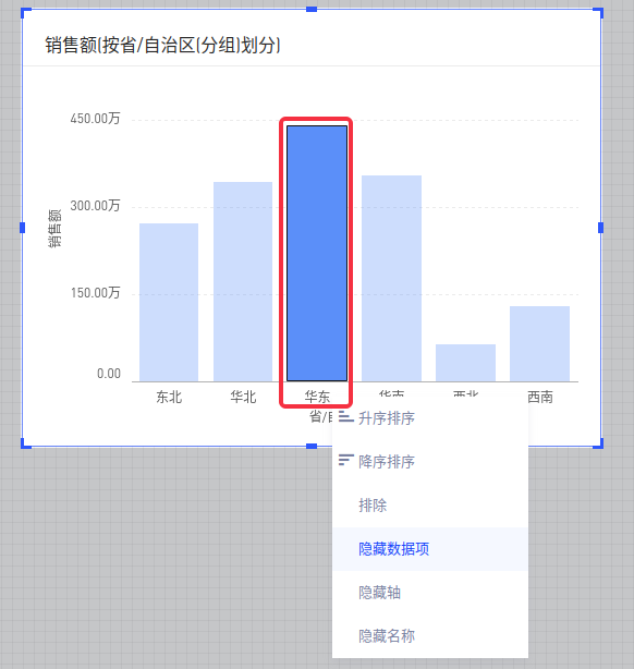 对于离散坐标轴,可以在轴上某一项单击右键,选择“隐藏数据项”,即可将该项的图形隐藏。(效果上等同于列表筛选)