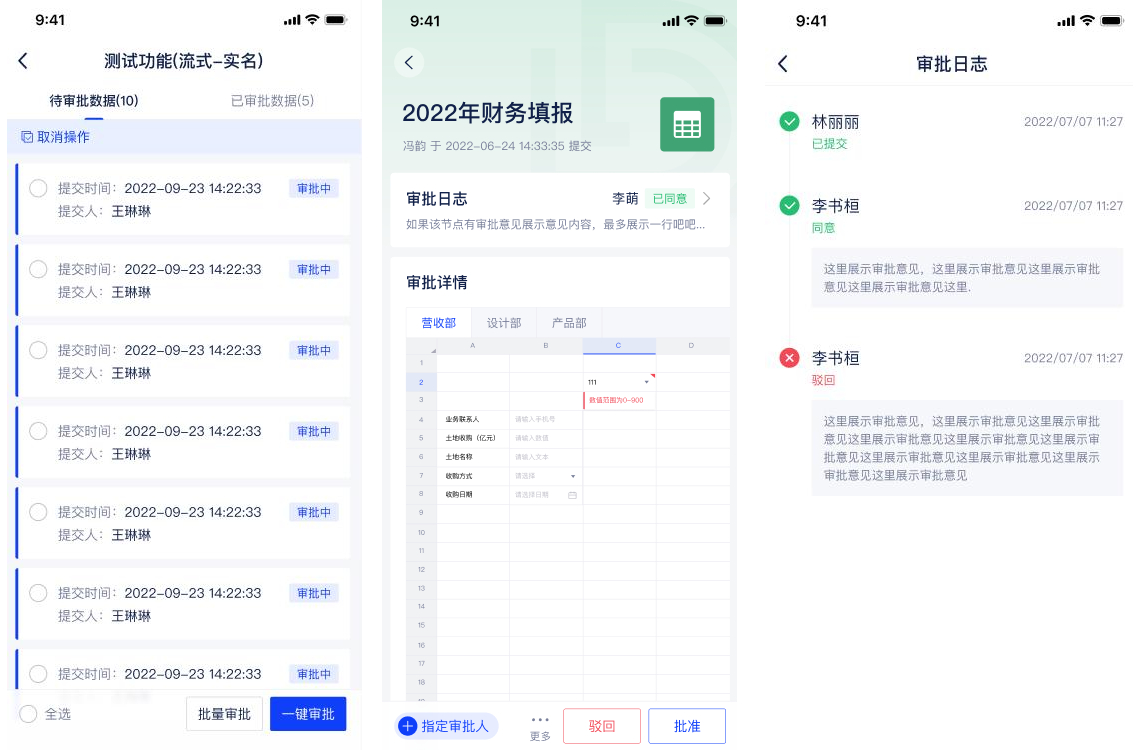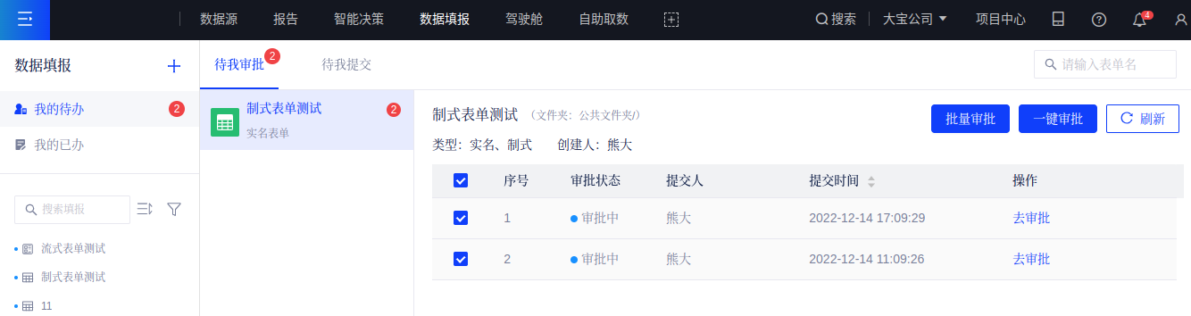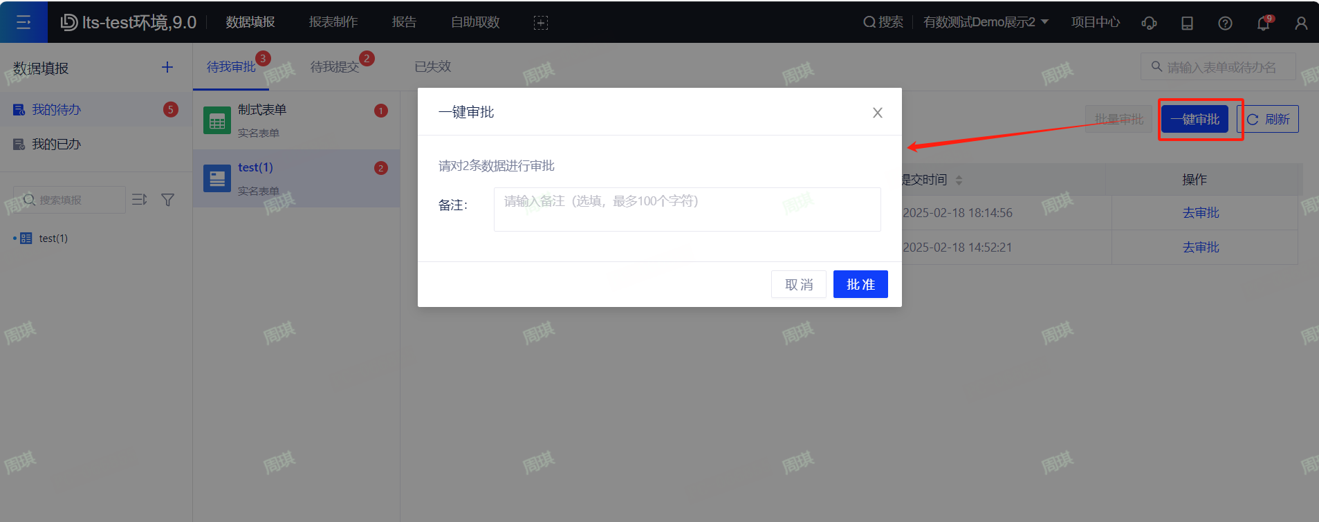 若选择“一键审批”,可以对当前表单下的所有审批数据进行批准(同意)操作。