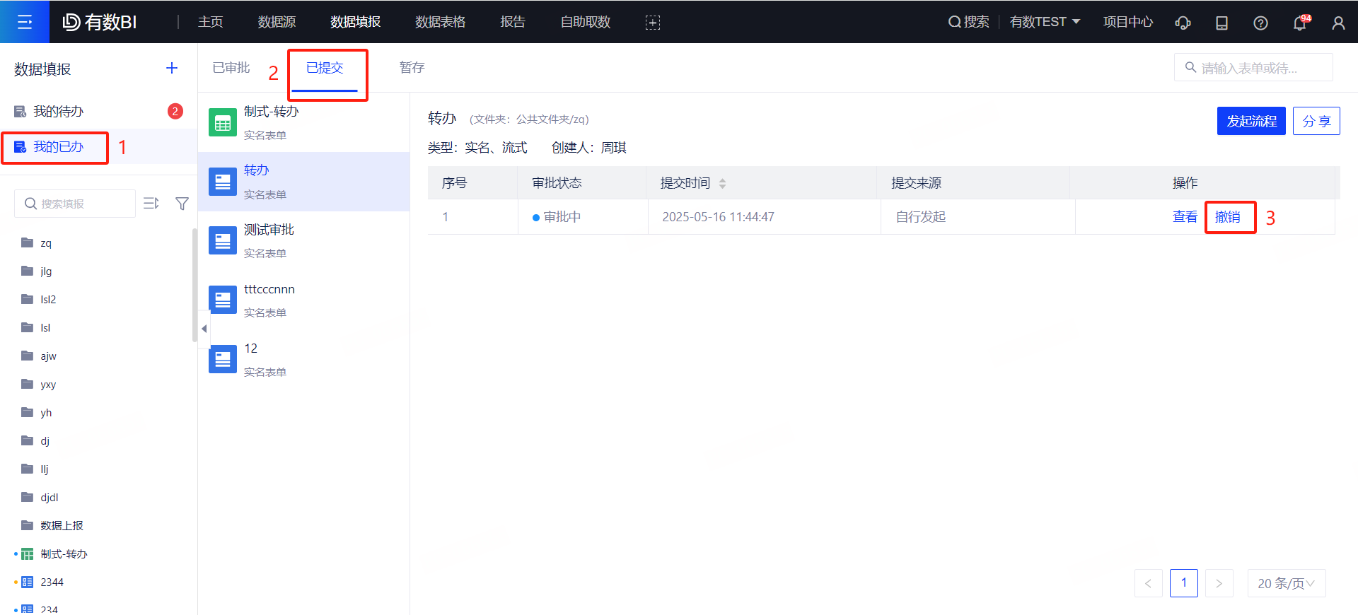 还在审批中的表单,提交人可自行撤销审批。