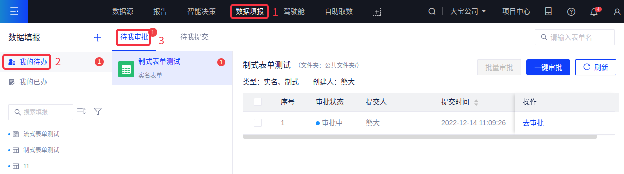 填报者提交的数据需要通过审批者审批后方可写入最终的数据库。在数据填报模块,依次点击【我的待办】-【待我审批】后,可以看到需要自己进行审批的表单列表,可对未审批的数据进行审批操作。