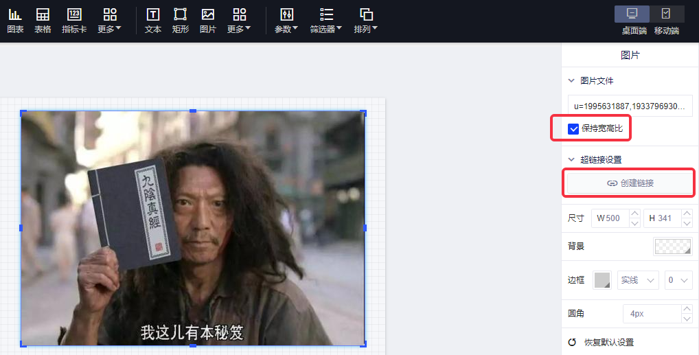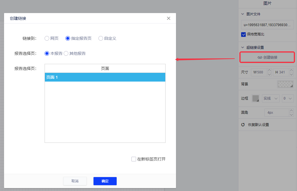 1. 概述2. 快速入门1. 概述图片控件可以帮助您在报告中添加图片元素,展示图片。 2. 快速入门(1)点选顶部的图片控件后,系统会自动弹出选择框,让您选择需要上传的图片; 支持的图片类型:gif、jpg、jpeg、bmp、png。 图片大小:单个文件大小在10M以内。 (2)上传完成后,您可任意调整图片大小,在右侧的图片设置面板中,可设置保持宽高比(默认勾选)、更改图片的边框、圆角大小等; (3)在右侧的图片设置面板中,点击“创建链接”按钮可设置图片的链接,支持网页、报告页、自定义JSON三种链接类型。