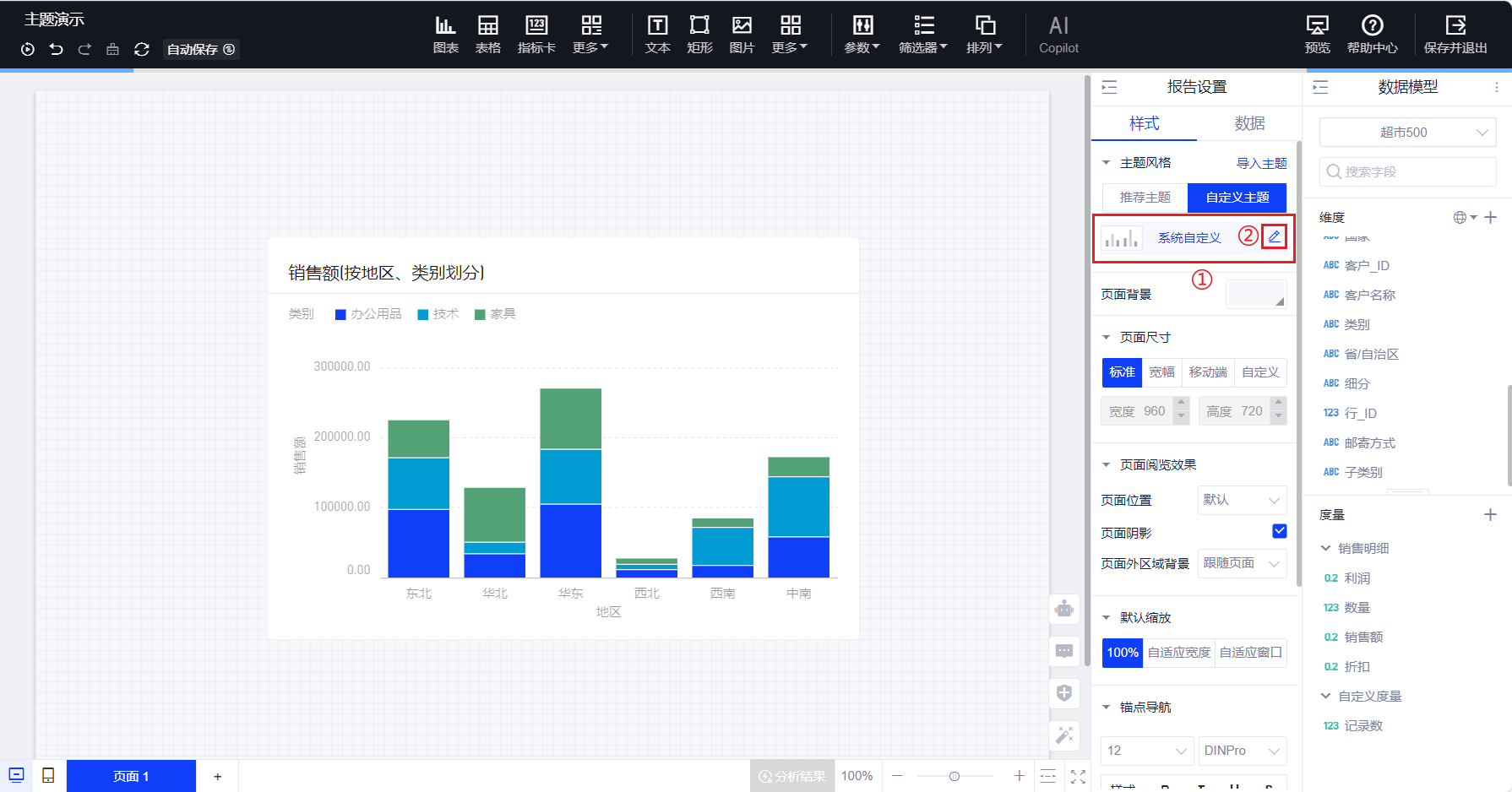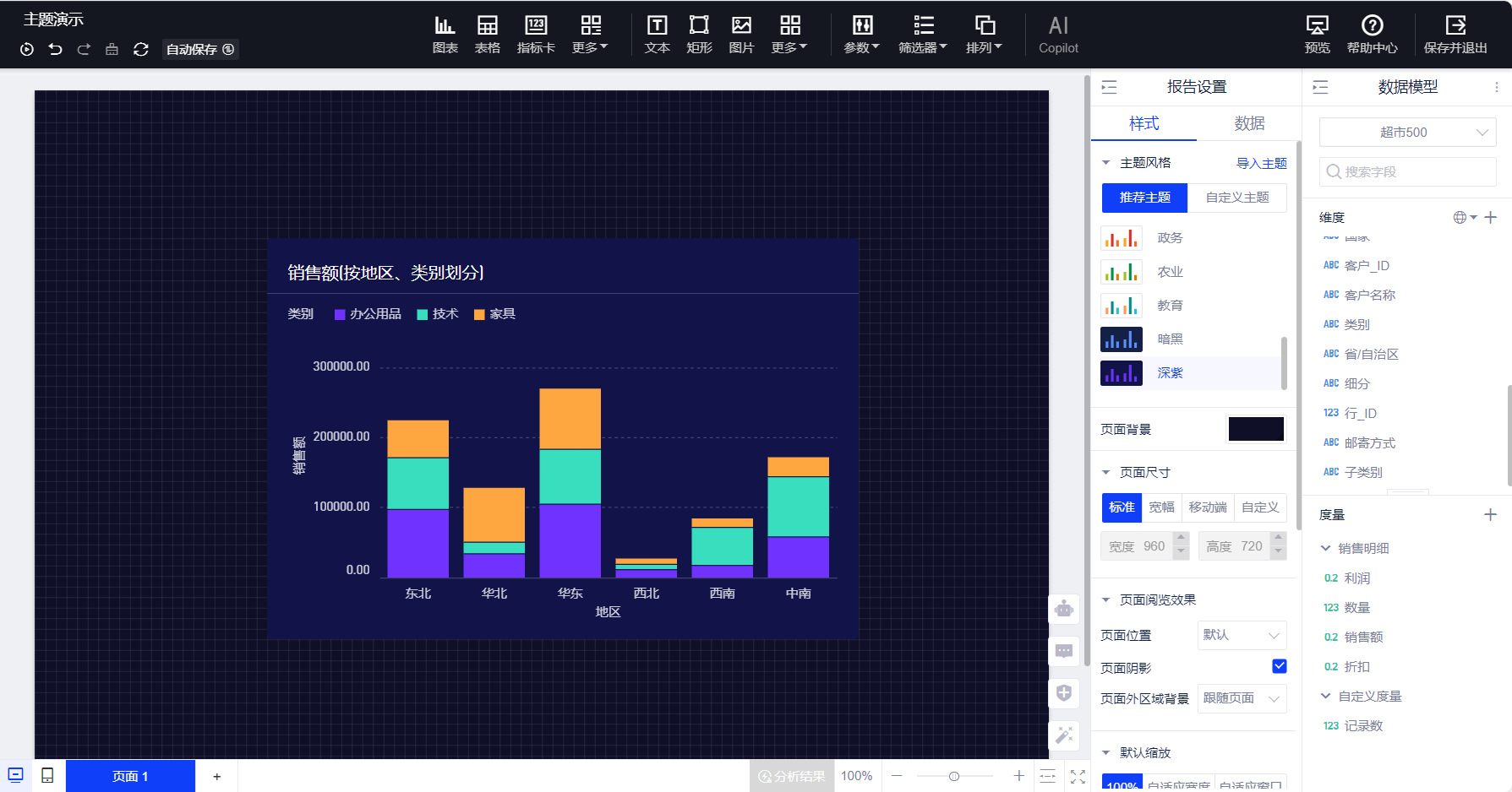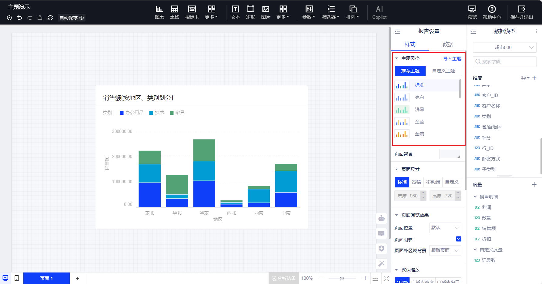 报告支持主题的配置,选择对应的主题后,可对报告上所有页面的图表统一配置配色、控件样式、图表样式、字体等,更好的作出美观好看的报告。