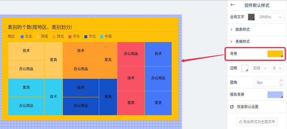 选择自定义主题并进入“控件默认样式”编辑页后,您可对全局文字、图表样式、表格样式、背景、边框、圆角、报告背景进行DIY。