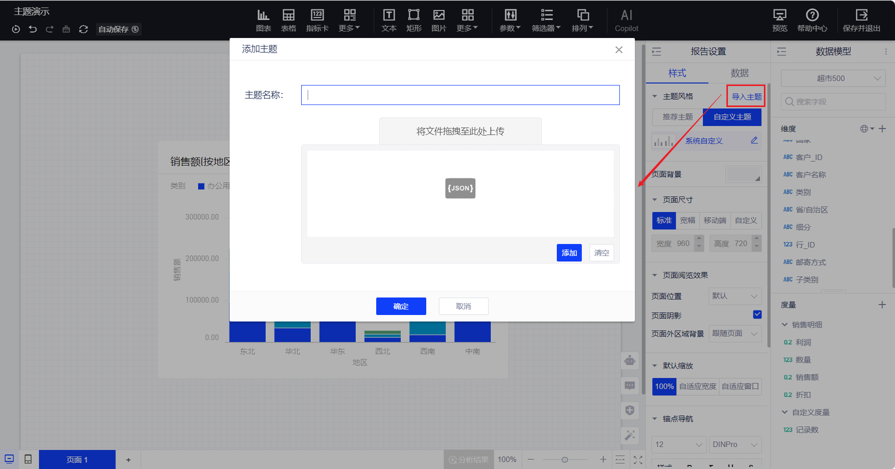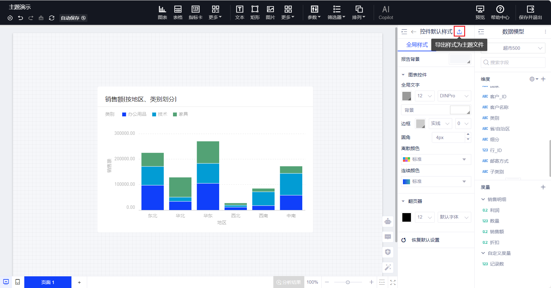 导出:您对报告中控件的样式设置完毕后,可将其导出为样式模版(模版为json格式的文件),留作之后制作报告时重复使用。