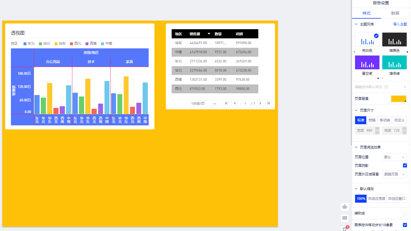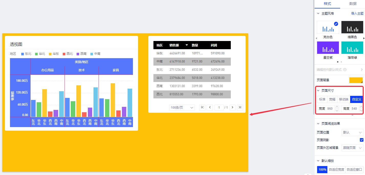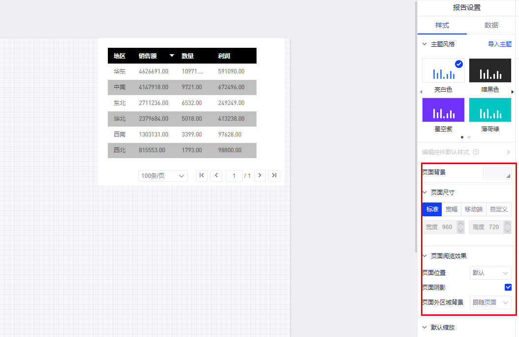 报告页面支持自定义设置,但页面样式设置只影响当前页面的样式,对其他页面不起作用。目前允许设置当前页面的背景颜色、尺寸和阅览效果,其他设置项跟随报告。