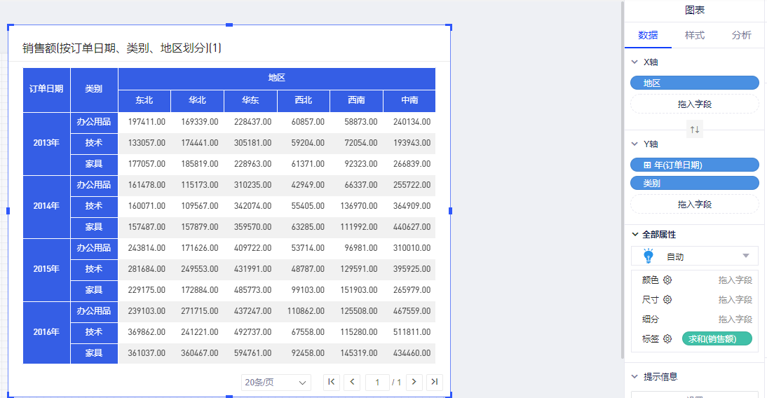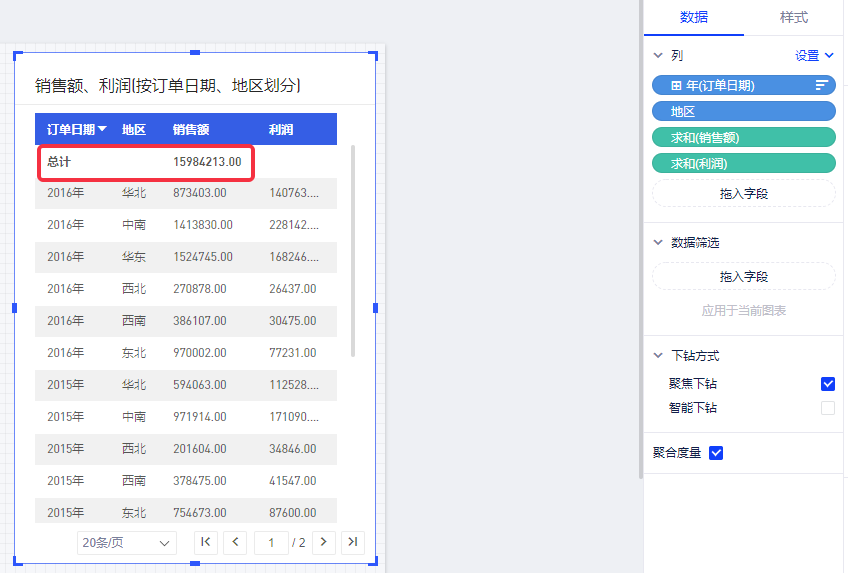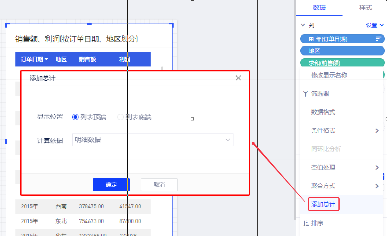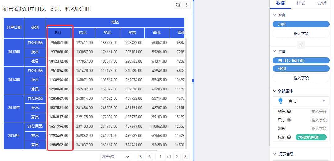 比如要为各个年度、各地区、销售额、利润情况的表格设置销售额的总计,即所有年度下所有地区的销售额。