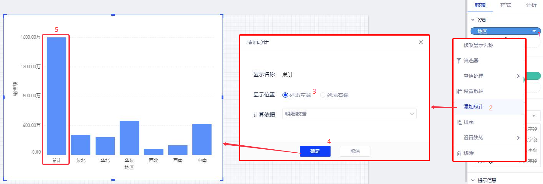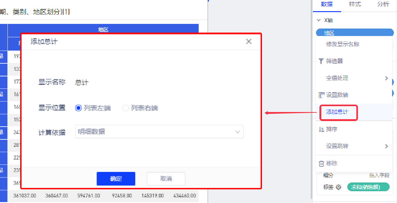(1)鼠标移动到X轴的维度“地区”,Hover点击下拉菜单,选择“总计”,然后选择总计选项中的“列表左端”;