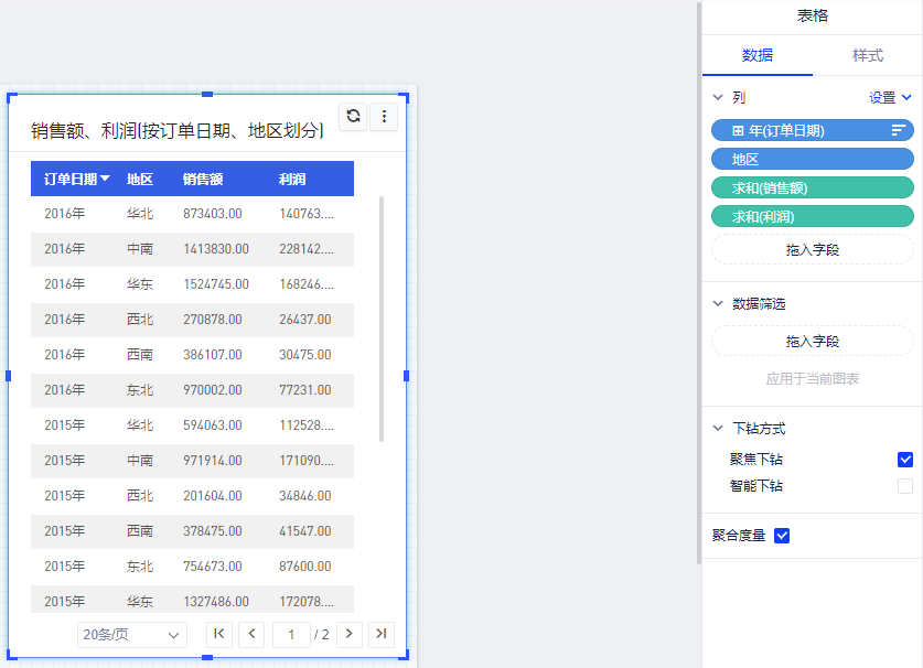 - 表格控件下画出的表格,在度量字段的下拉列表设置。