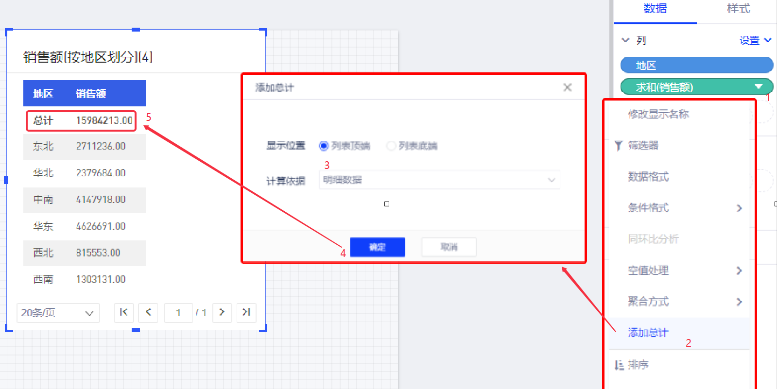 比如要为下图设置总计,即所有地区的销售额。