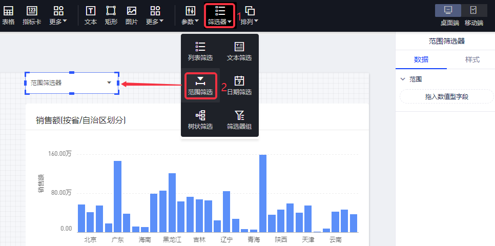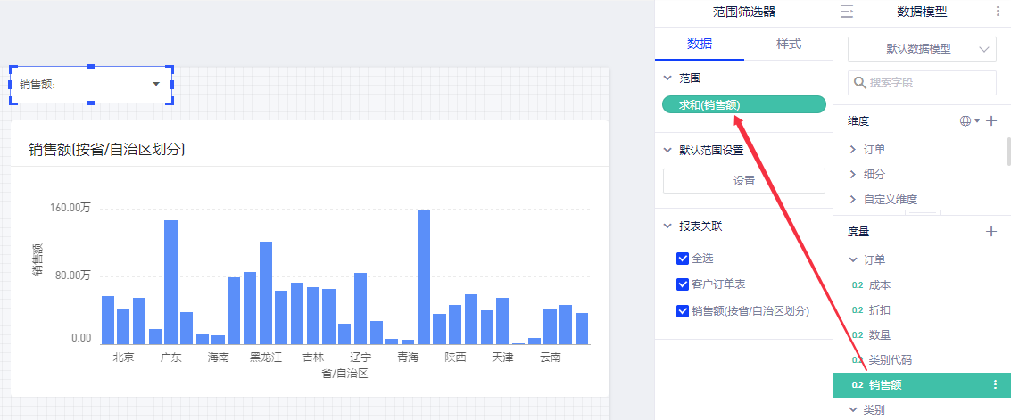 (2)在范围筛选器的数据面板的操作,将数值类型字段“销售额”拖入范围。默认是关联当前页面的同一数据模型的所有报表;