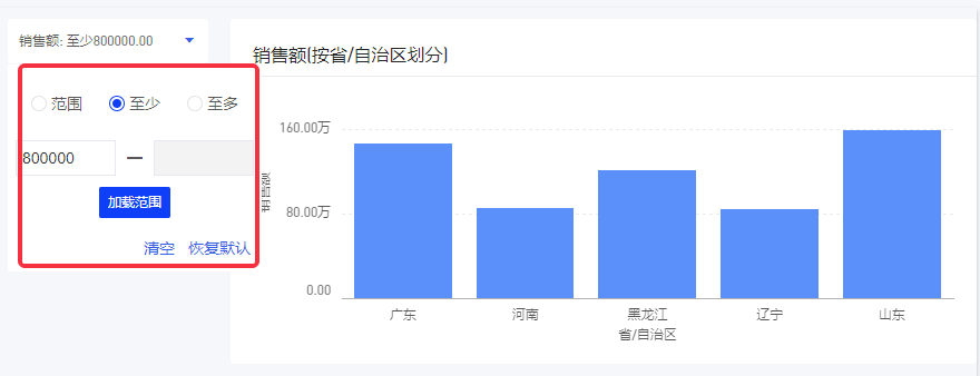 (4)您还可以点击“加载范围”去计算图表中的销售额取值范围,加载后筛选器控件内会显示取值范围,如图所示;
