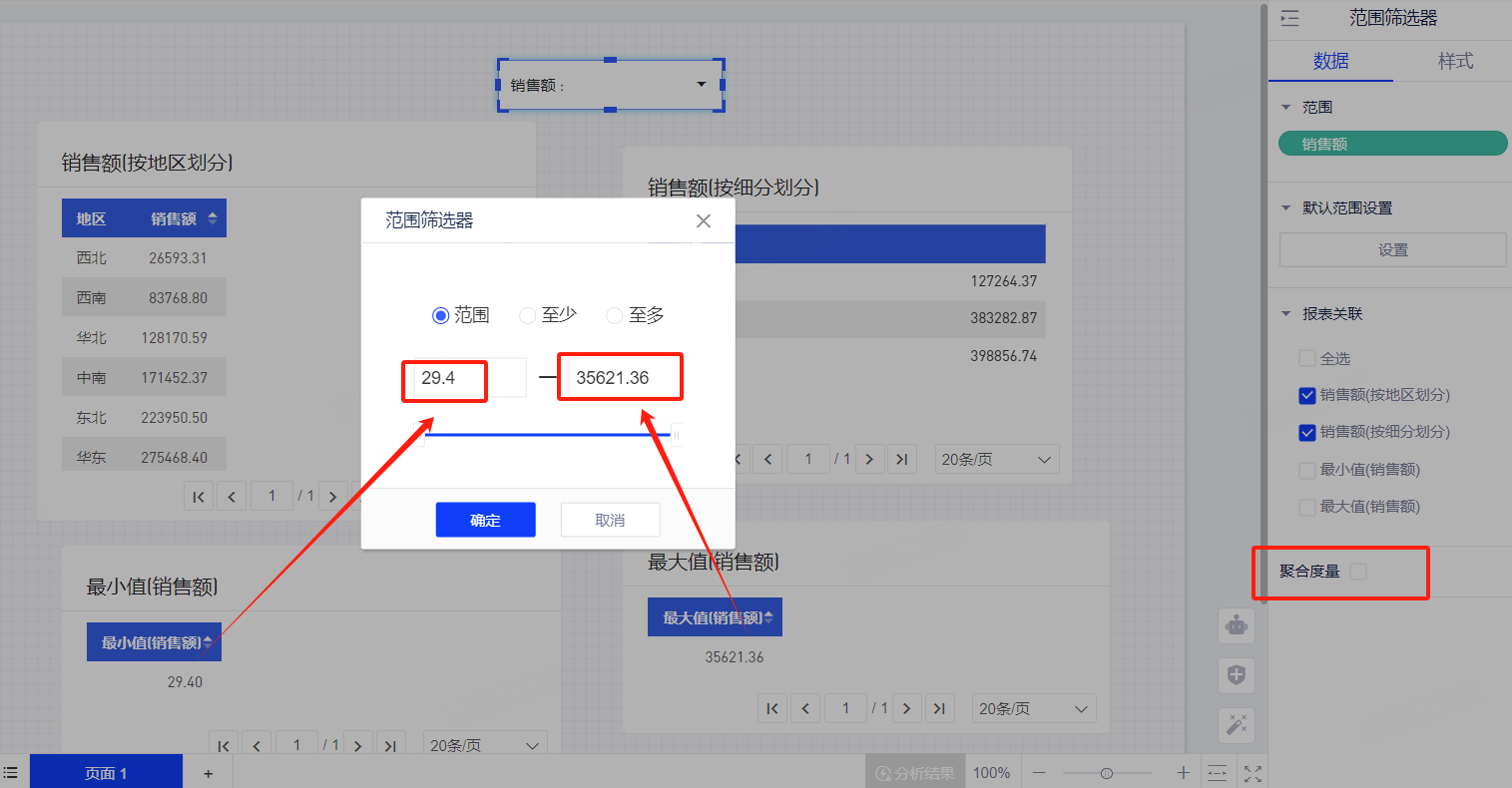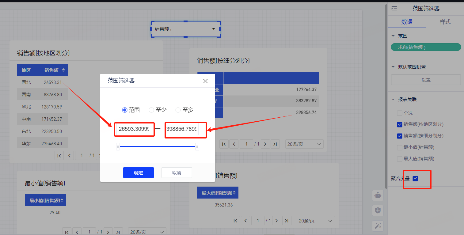- 例子:下图的销售额范围筛选器关联了两个表格,范围筛选器会获取两个表格聚合后的销售额最大值和最小值,并取两个表格销售额的并集获得最终的最大值和最小值。