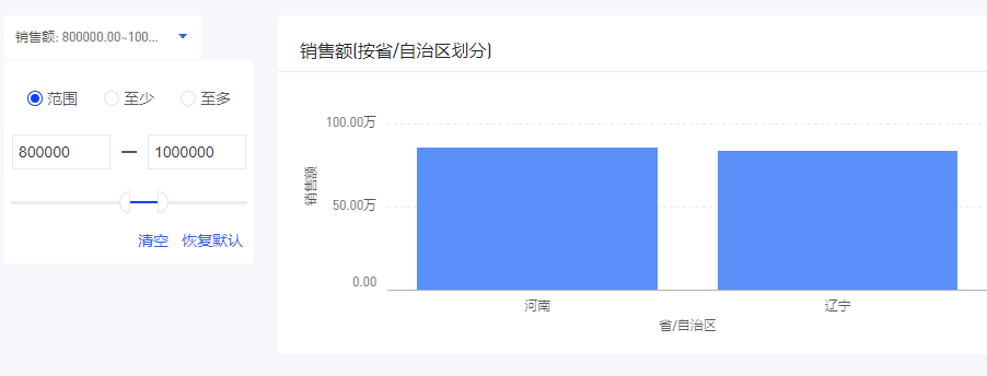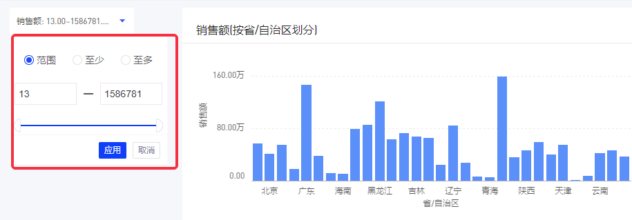 当您想要用数值型字段对图表进行筛选时,比如“筛选出销售额总和大于80万的省份”,可以借助范围筛选器控件。本文将举例演示范围筛选器控件的用法。