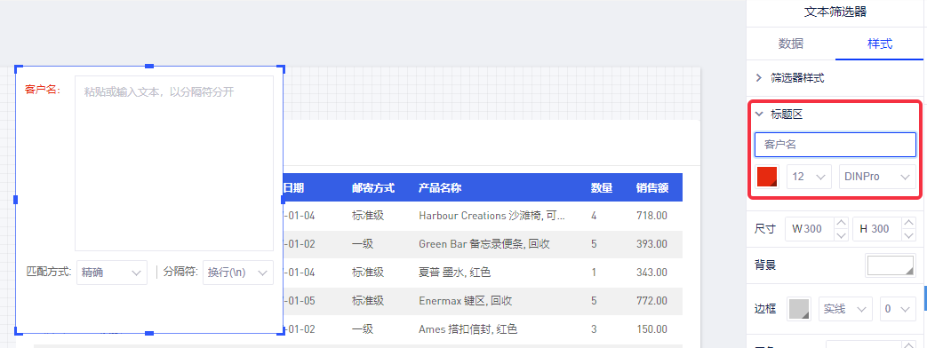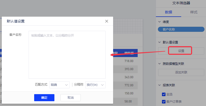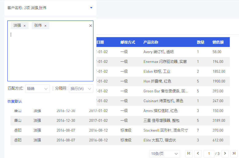 (3)在预览状态下验证效果,可在文本筛选器输入框中粘贴或输入筛选的文本(客户名称),多个值之间以分隔符分开,匹配方式支持精确、模糊匹配,满足多场景的情况应用,分隔符支持换行、分号、空格,可选择不同分隔符进行分隔;