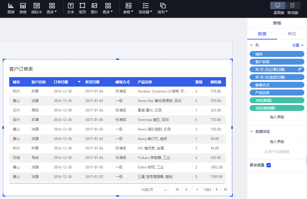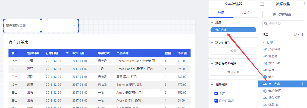 (2)将字段“客户名称”拖入维度。默认是关联当前页面的同一数据模型的所有报表;
