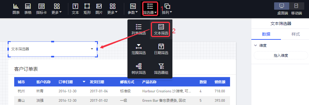 (1)在报告编辑页面,选择“文本筛选”控件,在画布上添加一个“文本筛选器”;