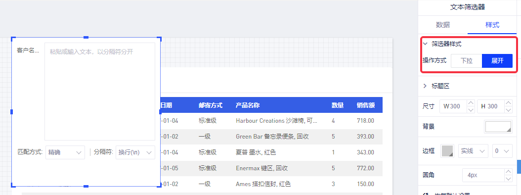 (1)选择画布上的文本筛选器,点击筛选器的样式面板,可选择筛选器的类型:下拉或展开(截图为展开样式);
