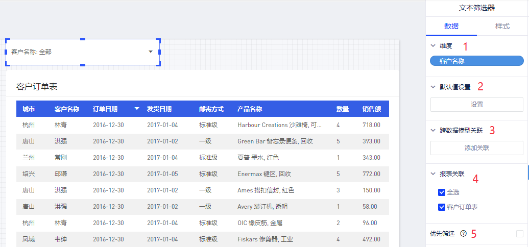 (5)优先筛选:若图表内设置了数据筛选,勾选优先筛选后,则该筛选器将优先于图表内的数据筛选。