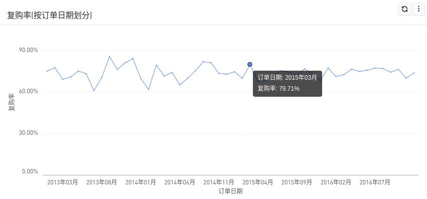 (2)将维度字段“订单日期”和度量字段“复购率”分别拖入x、y轴;然后将“订单日期”的日期类型改为年月、“复购率”的数值格式改为百分比。可用折线图表现复购率的走势,如下图所示: