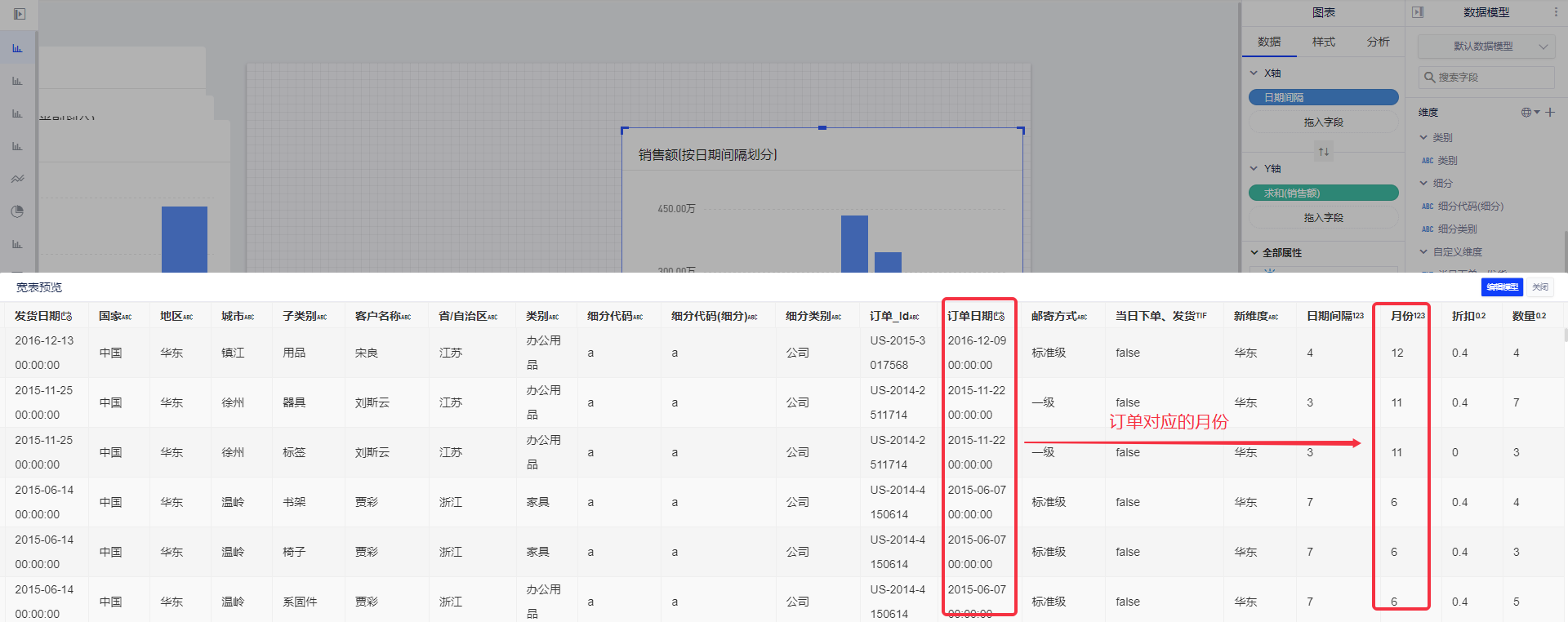 这时,我们想计算“发货日期”是在几月份时,可在计算字段的表达式输入框中输入:DATEPART("month",[发货日期])