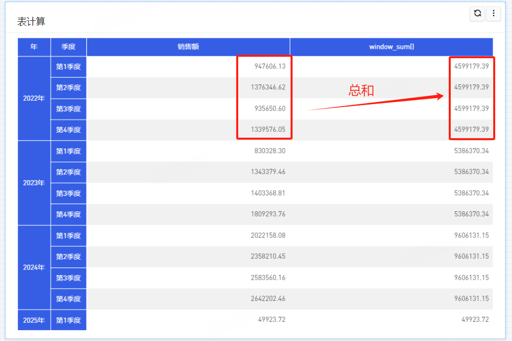 例如,下面的视图显示每季度销售额。以年分区中的窗口计算整个分区下所有季度销售额总和。
