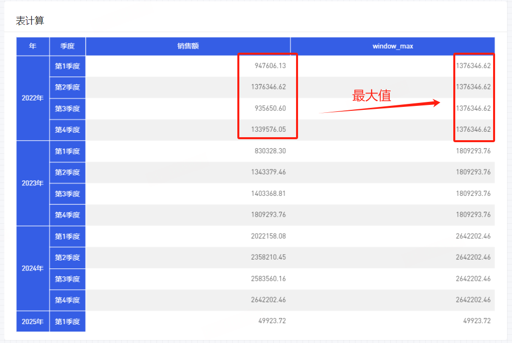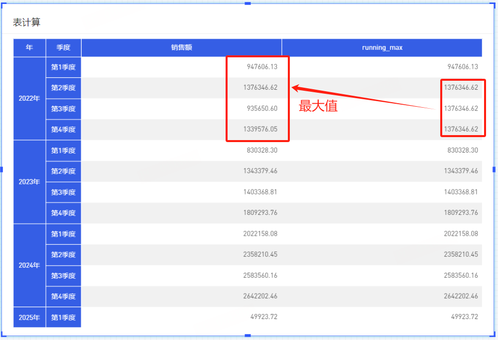 示例:RUNNING_MAX(SUM([销售额])) along [年],[季度]