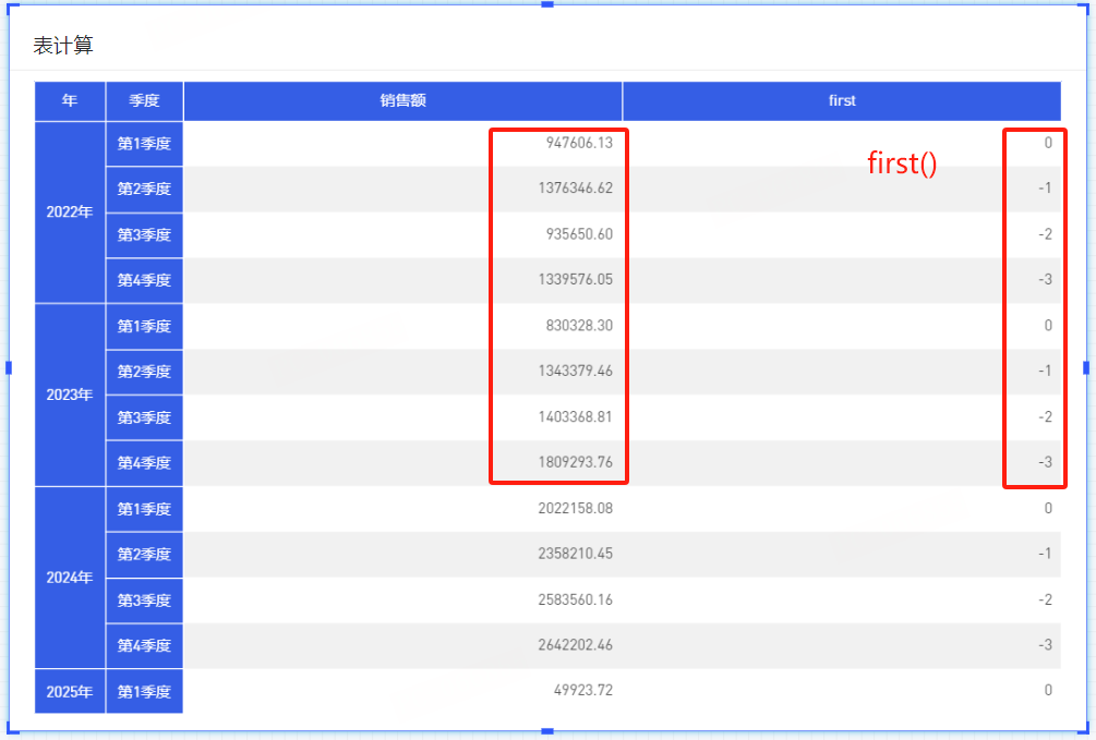 返回从当前行到分区中第一行的行数。例如,下面的视图显示每季度销售额。在年分区中计算 FIRST() 时,第一行与第二行之间的偏移为 -1。
