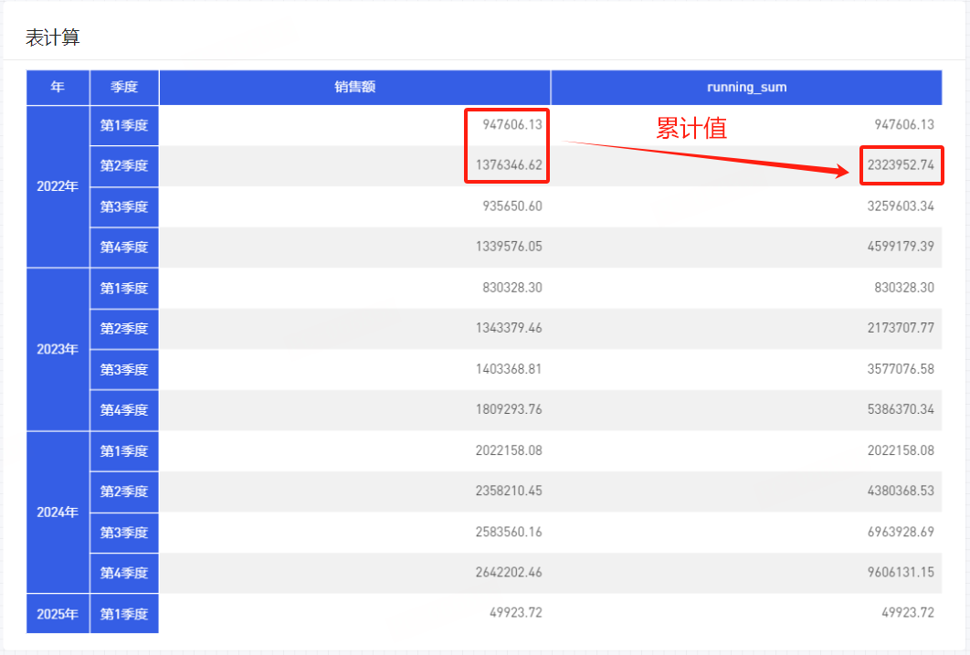 示例:RUNNING_SUM(SUM([销售额])) along [年],[季度]