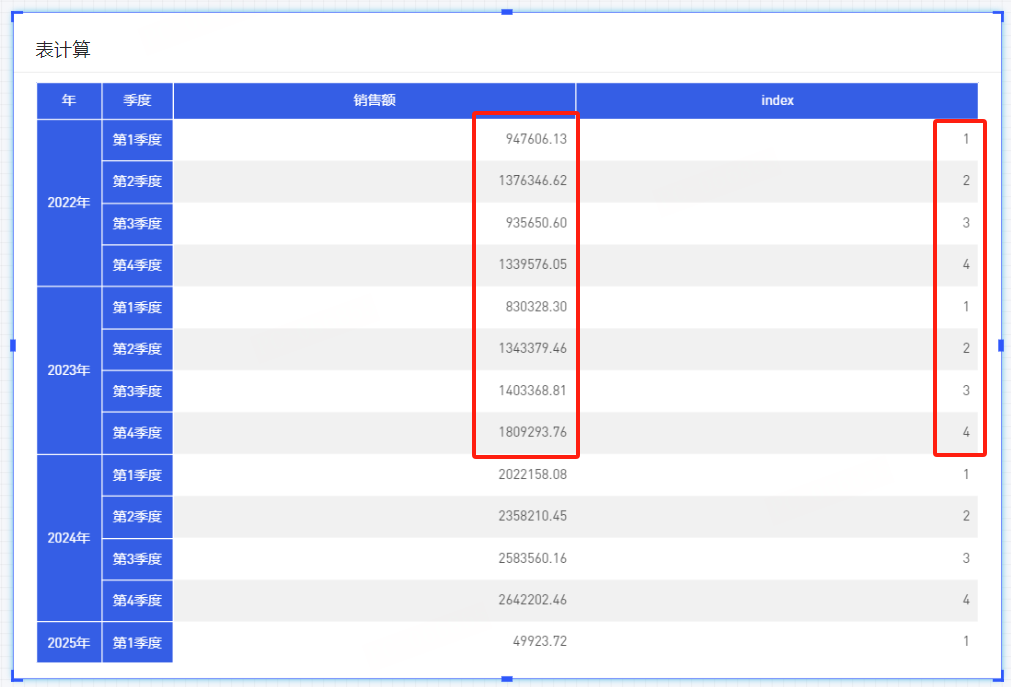 返回分区中当前行的索引,不包含与值有关的任何排序。第一个行索引从 1 开始。例如,下表显示每季度销售额。当在年分区中计算 INDEX() 时,各行的索引分别为 1、2、3、4 等。