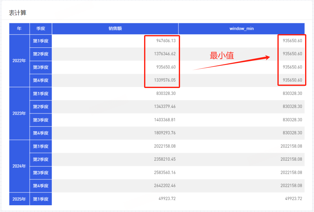 例如,下面的视图显示每季度销售额。以年分区中的窗口计算整个分区下所有季度的最低销售额。