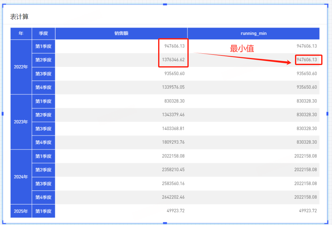 示例:RUNNING_MIN(SUM([销售额])) along [年],[季度]