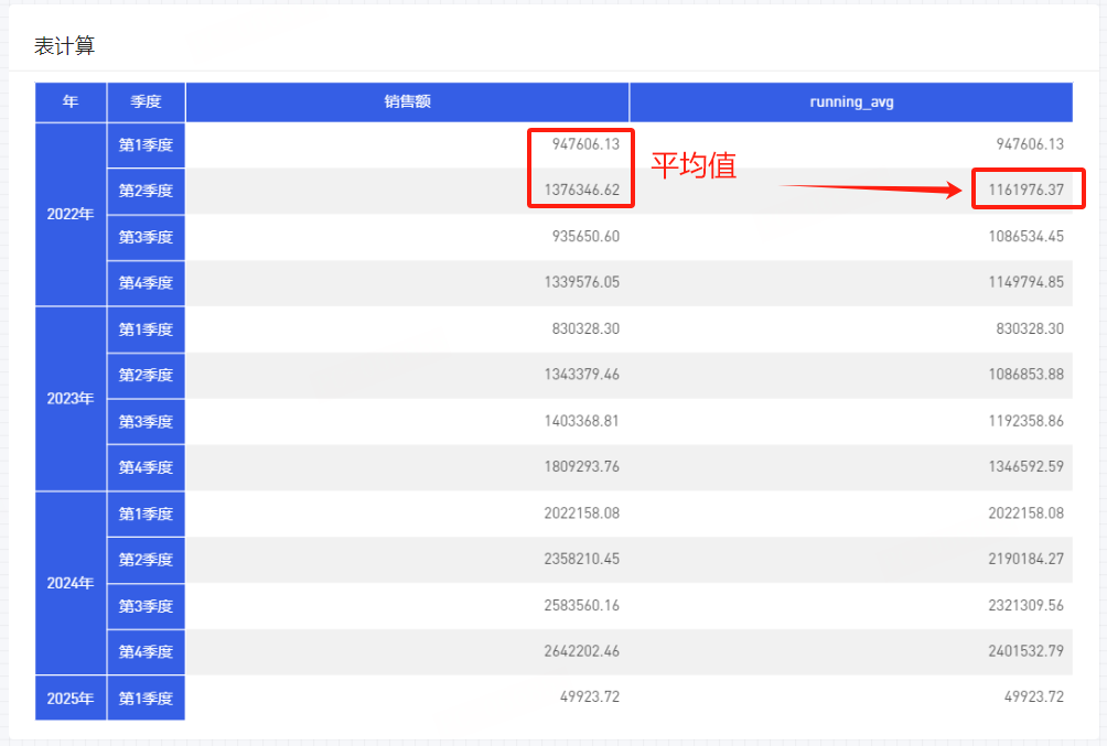 返回给定表达式从分区中第一行到当前行的运行平均值。下面的视图显示每季度销售额。当在年分区中计算 RUNNING_AVG(SUM([销售额]) 时,结果为每个季度的销售额值的运行平均值。