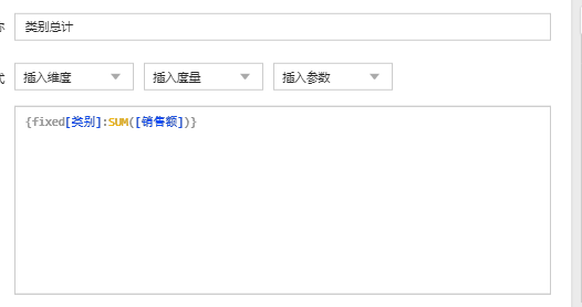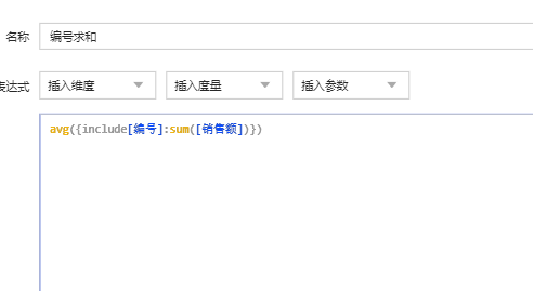 语法如下:{Include [维度1],[维度2]:sum([度量1])}