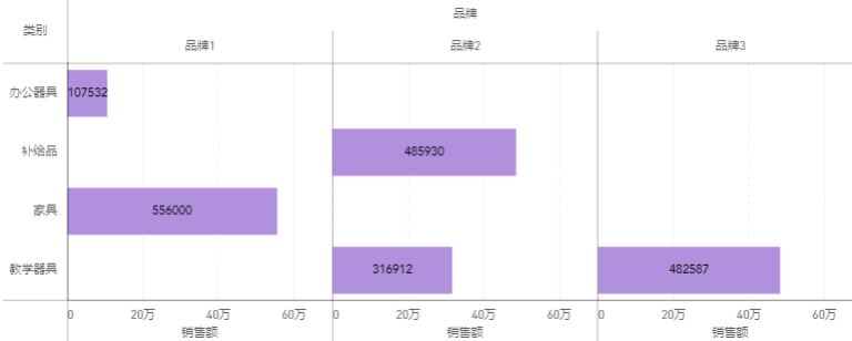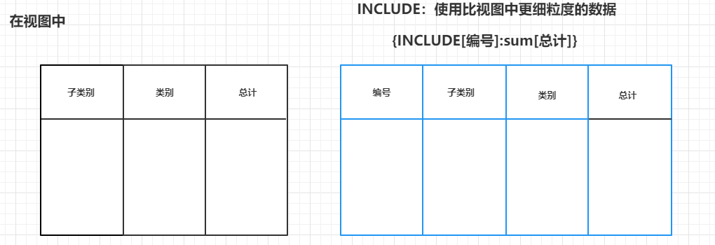 例子:在视图中已有子类别和类别。要计算每个子类别、类别和每一个编号产品的销售额总和,但不想要在视图显示维度编号,就可以用{include[编号]:sum(销售额)}
