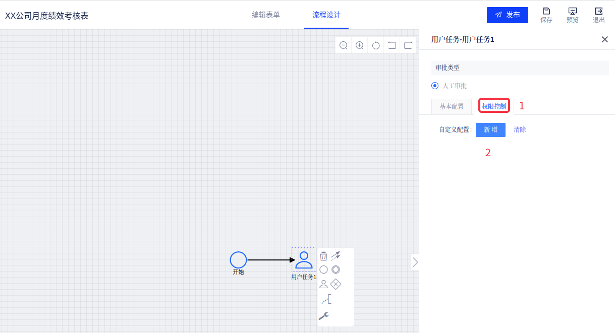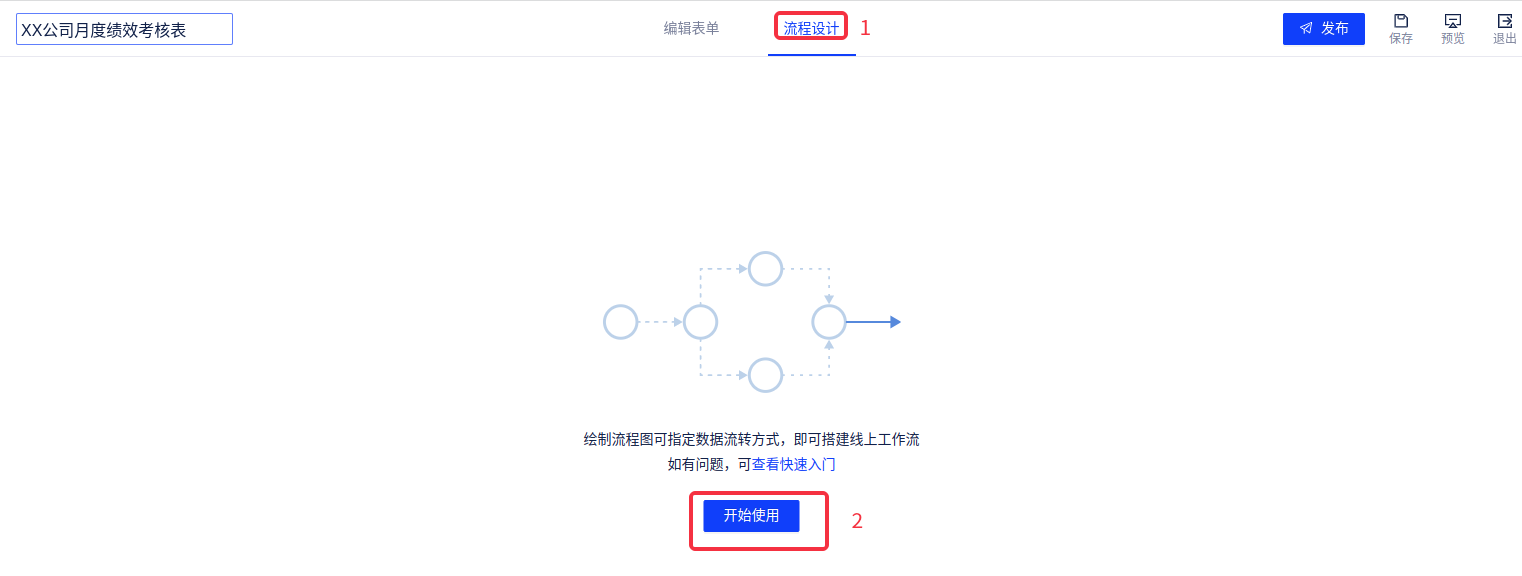 (1)表单保存后,点击顶部的“流程设计”按钮,进入流程设计页面