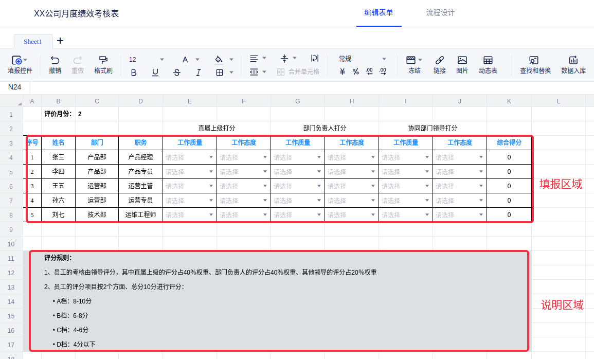 - 填报区域:在单元格添加信息和控件,用户在此处填报数据