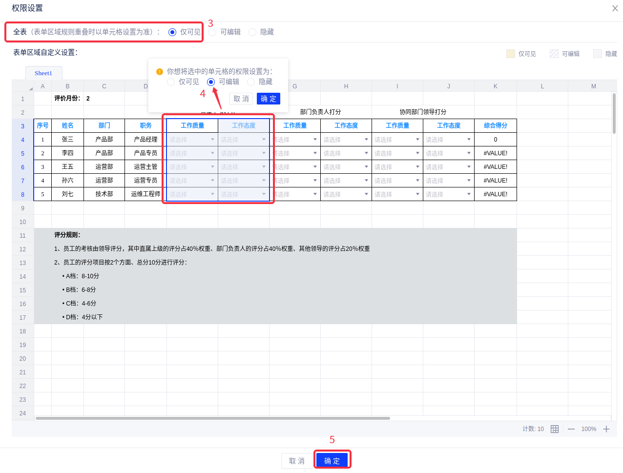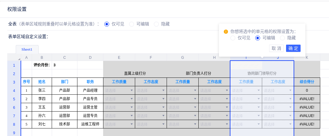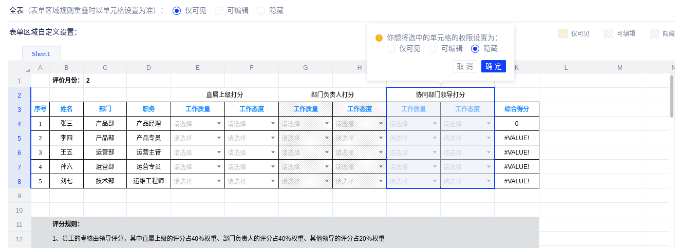 在权限控制中,将I、J列设置为可编辑,E、F、G、H、K列设置为隐藏(不需要其他部门领导看到评分)