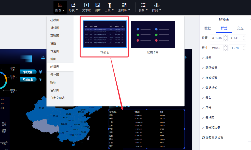 (3)出于演示需要,我们选择了“保险大屏”主题,然后进入大屏编辑页面;