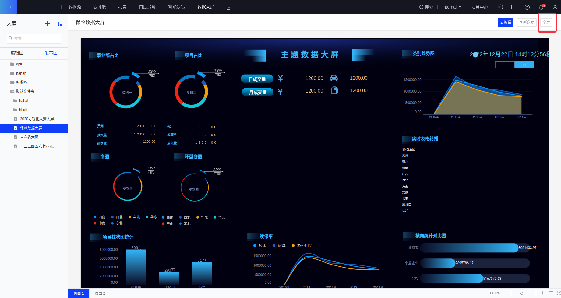 在大屏界面点击想要展示的大屏,点击全屏就可以把大屏展示出来。操作步骤如下图所示: