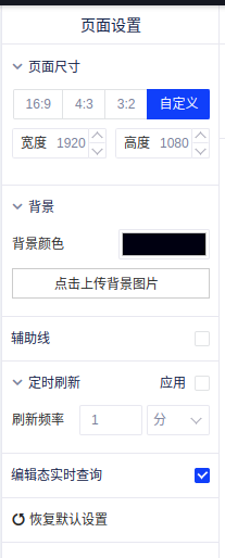 在大屏的编辑状态,针对当前页面,您可以调整页面尺寸(比例和分辨率)、背景色或背景图片、开启辅助线(像素1px的网格线,辅助定位)和刷新频率。