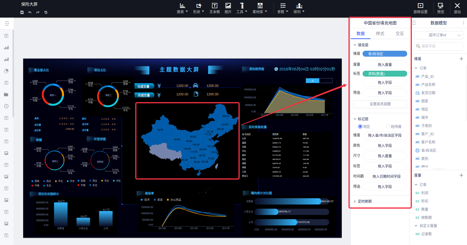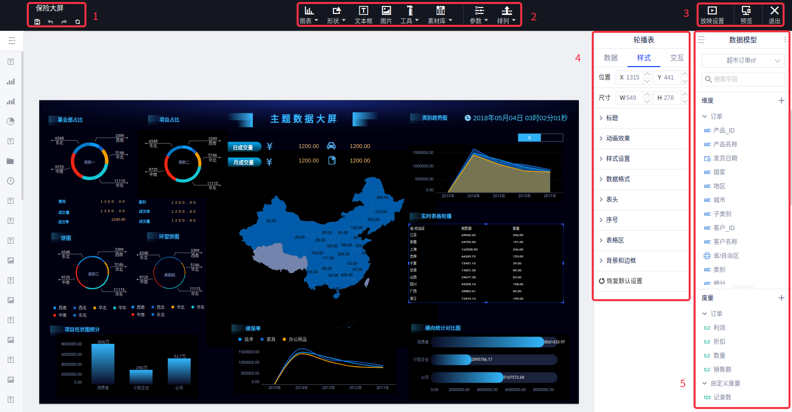 - ⑤数据模型:添加需要的数据模型到大屏中,可以在调整&设置区中将数据引入大屏控件中。
