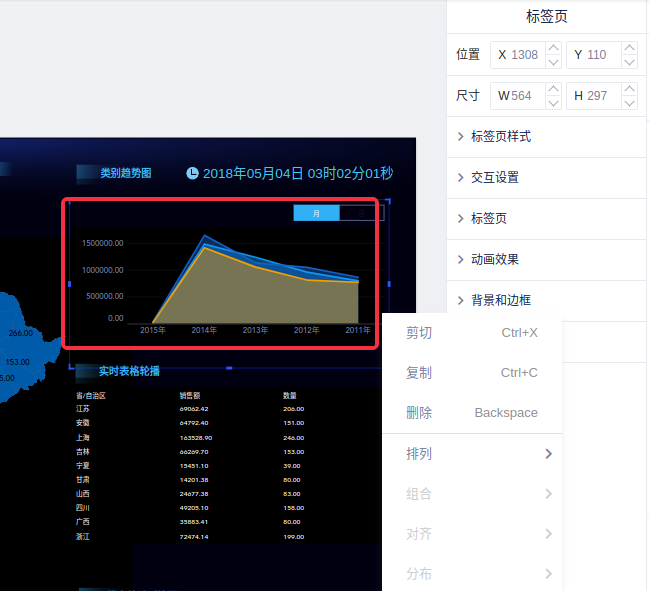 (1)在大屏的编辑状态,选择需要更改的控件,您可对其删除、移动、修改大小,右键选中控件可以剪切、复制以及排序控件;
