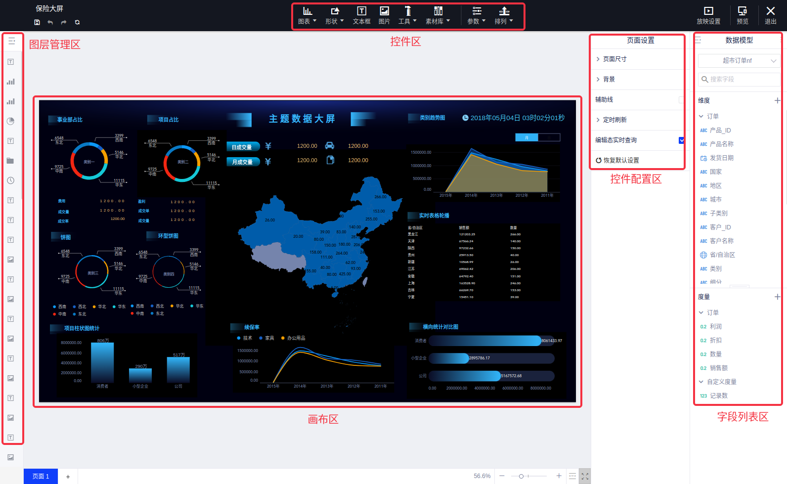 - ②大屏图表控件区:在建立大屏时,大屏中所需要的图表、形状、文本框、插入图片、插入素材以及更改图层排列顺序的操作都在这里,本区是大屏内容的发源处。