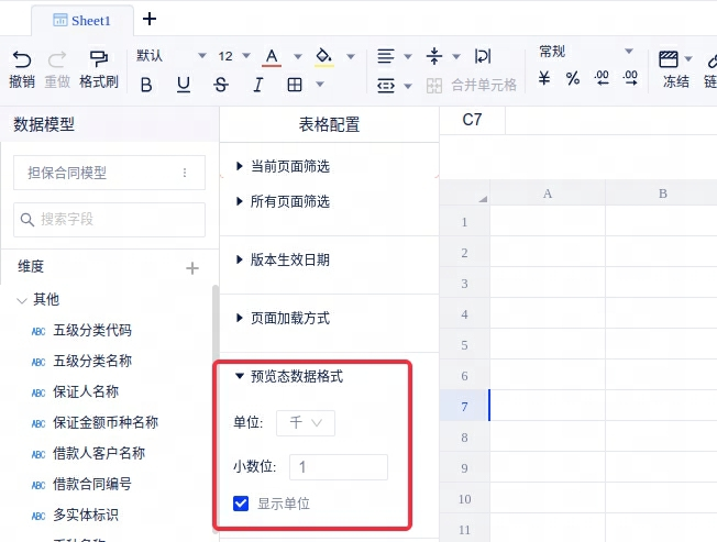 4、当前页面单位、小数位设置入口调整,实现方式优化。这里的单位、小数位设置面向当前页面的所有单元格生效。若之后针对个别单元格设置了新的数据格式,则以最新的设置为准。