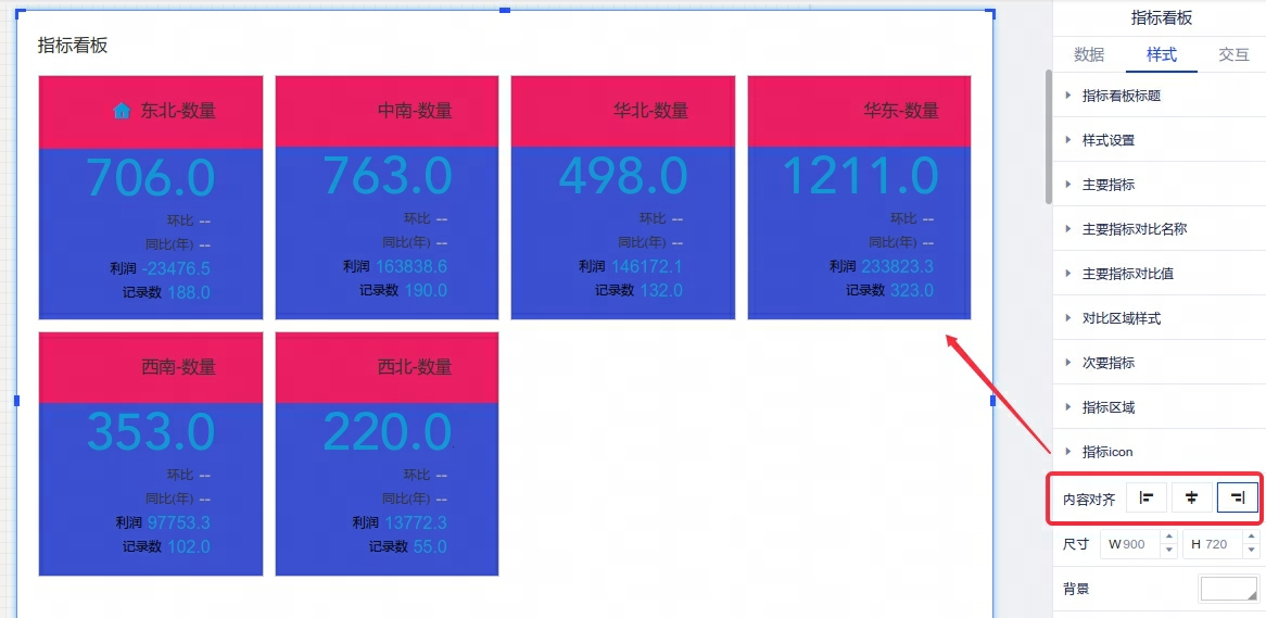 2、指标卡、指标看板新增内容位置、与指标对齐方式功能。