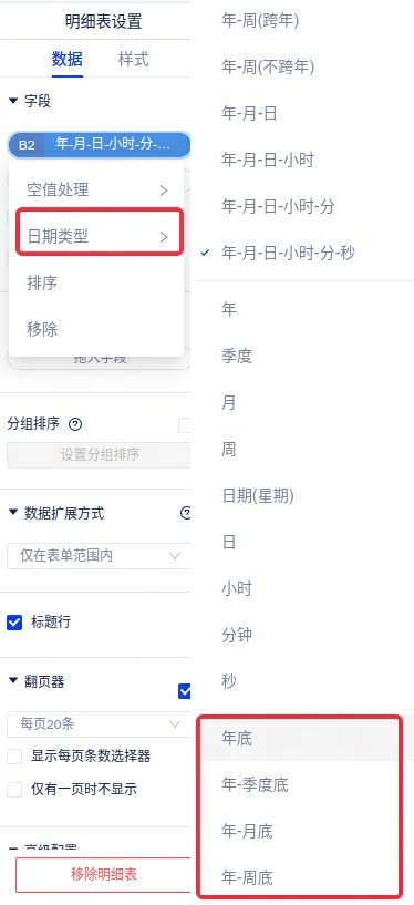 1、日期类型新增年底、季度底、月底、周底四个日期粒度,分析师可以配置日期粒度选择。