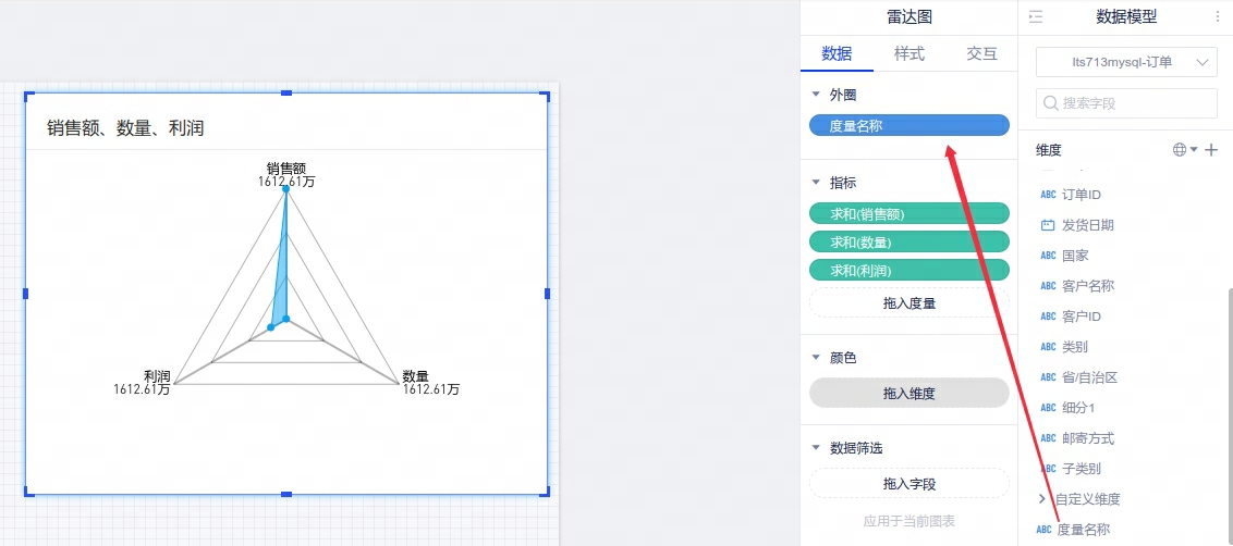 1、【图表】雷达图外围新增”度量名称“,分析师可以将度量名称拖入外围,以便对不同指标进行分析对比。