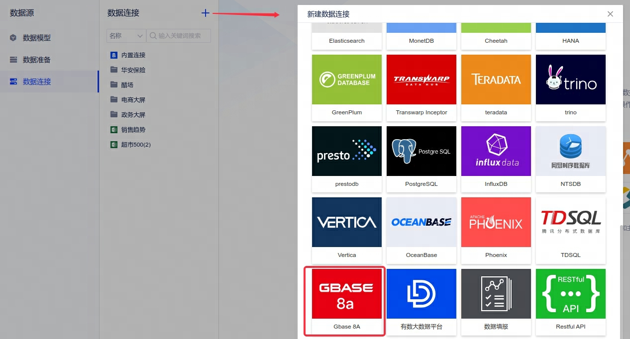 1、【数据连接】数据源适配Gbase 8A,您可以在【数据源】-【数据连接】-【新建数据连接】中找到它的配置入口。